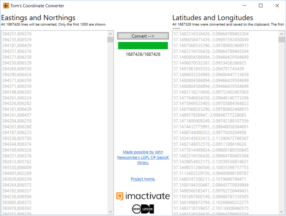 I got so tired of converting eastings and northings to latitudes and longitudes that I wrote my first ever desktop Windows application to help. Paste comma-seperated Eastings and Northings in at the left, get comma-seperated Latitude and Longitudes out on the right. It's that simple.